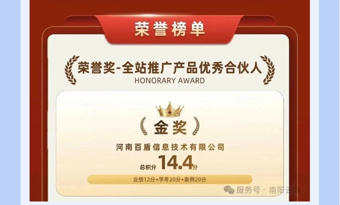 值得關(guān)注的是,河南百盾近期還斬獲了"全站推廣產(chǎn)品優(yōu)秀合伙人金獎"。