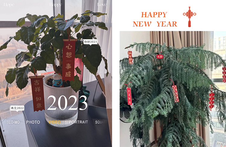 前臺處還布置一些兔年拉花,綠植上更是吊上大小不等的精致掛件,朝氣蓬勃,彰顯活力。