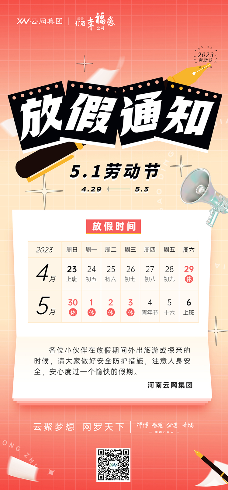 五一勞動節(jié)放假5天(4月29日-5月3日),5月4日(周四)正常上班。
