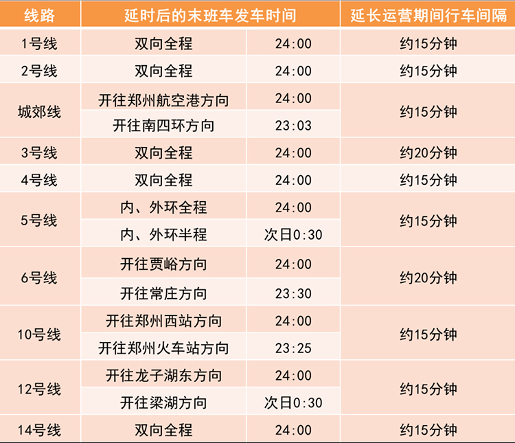 2月24日(元宵節(jié)當(dāng)天),鄭州地鐵線網(wǎng)總體延長運營服務(wù)時間至24:00,
